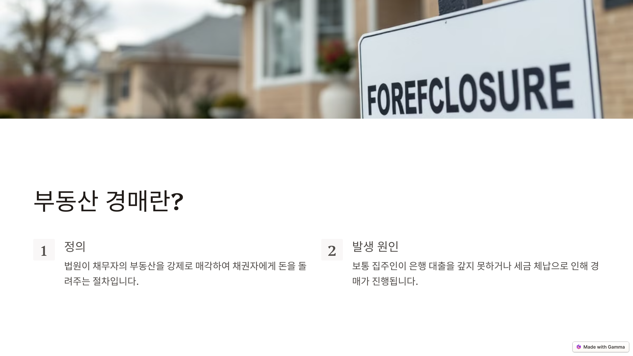 부동산 경매란 법원이 채무자의 부동산을 강제로 매각하여 채권자에게 부채를 보유해 주는 진행 절차입니다. 주변에서도 지연 대출 거래를 개입하지 못하거나, 세금 체납 등으로 인해 경매가 진행되는 경우가 많습니다.